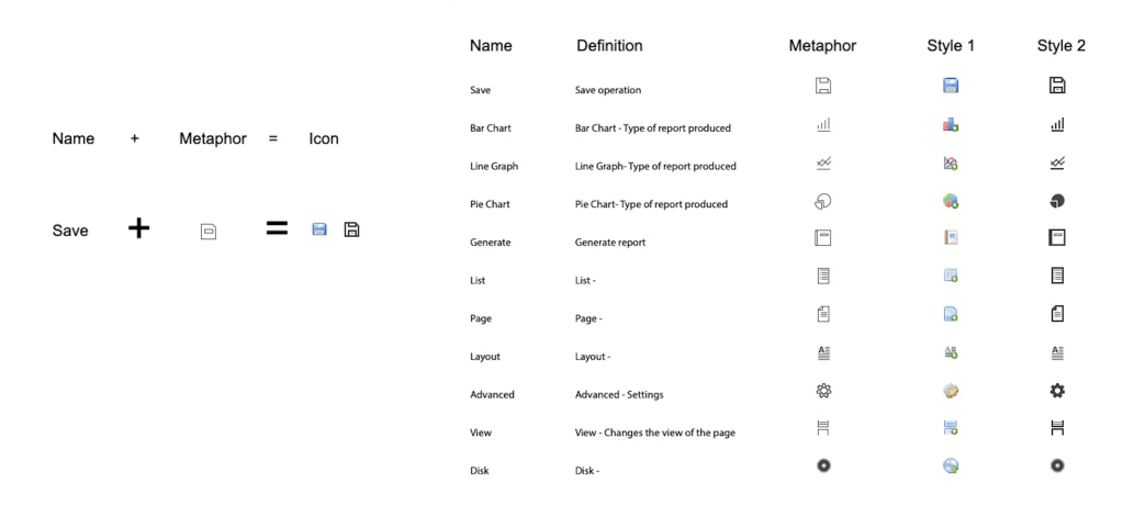 It is key to get this next bit correct. The equation above is what will make your icon system work. The “name” plus the “metaphor” makes the icon, mostly. This equation does have a few extra parts that mus be agreed upon. The “name” must have an agreed upon definition and “metaphor” as there can be multiples for each.